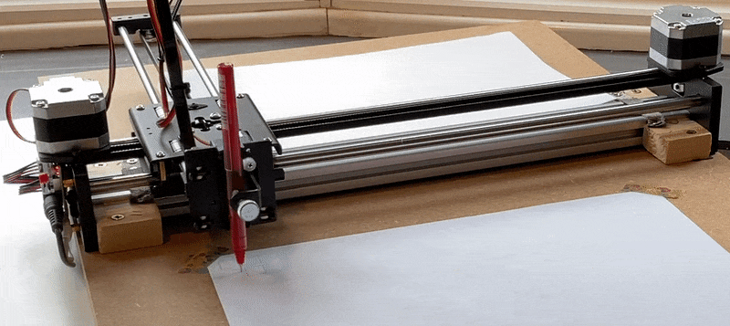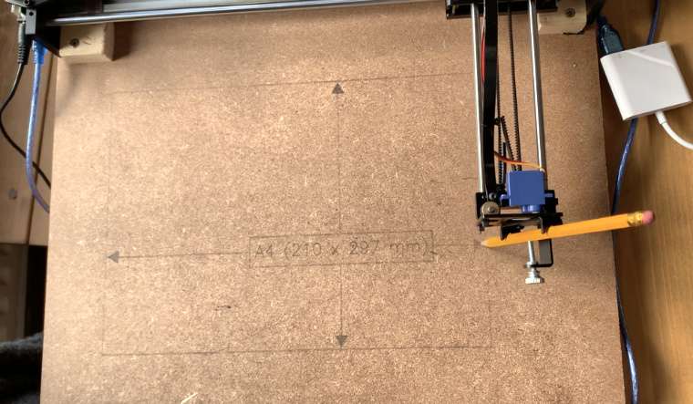 I quickly learned that the hardest part would be aligning the pen plotter with an A4 sheet of paper, and then maintaining that alignment for subsequent plots. I didn't like the idea of having to re-calibrate such a setup every time I wanted to plot something, so I sought a less temperamental solution.