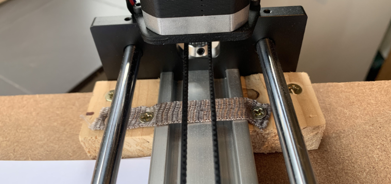 I lined up the pen plotter to where I wanted it on the wooden sheet, held it down with a couple of clamps, and screwed four small blocks of wood tightly against its base. This was enough to keep it in, even when dangling it upside-down. To be safe, I fastened down the plotter with some anti-tip straps I had leftover from an old IKEA wardrobe.